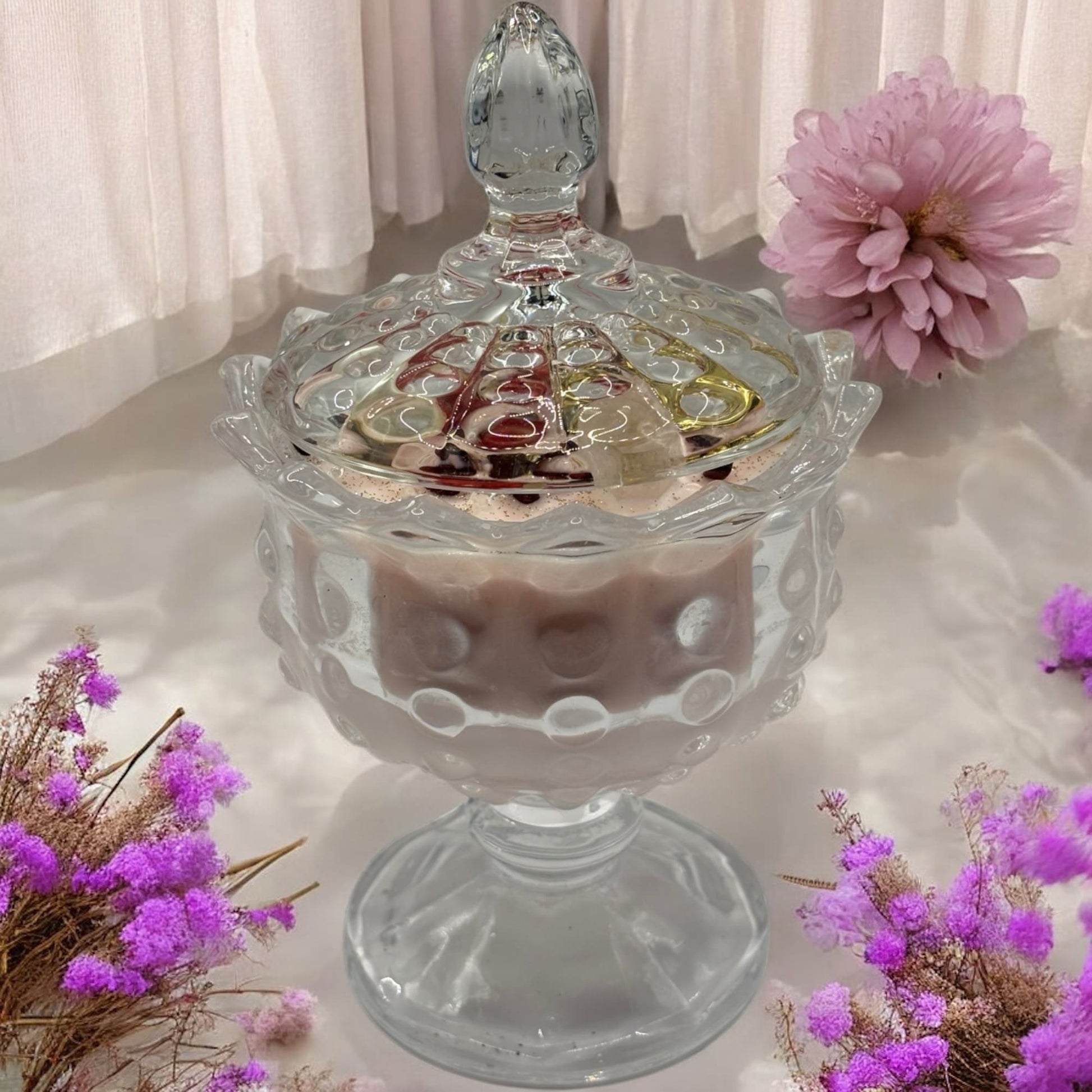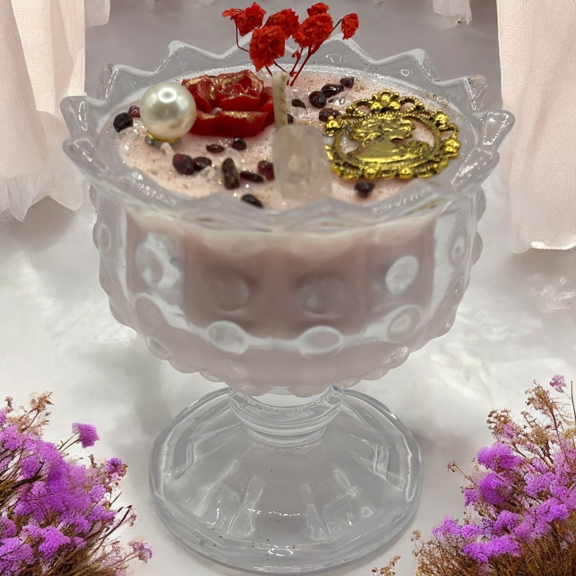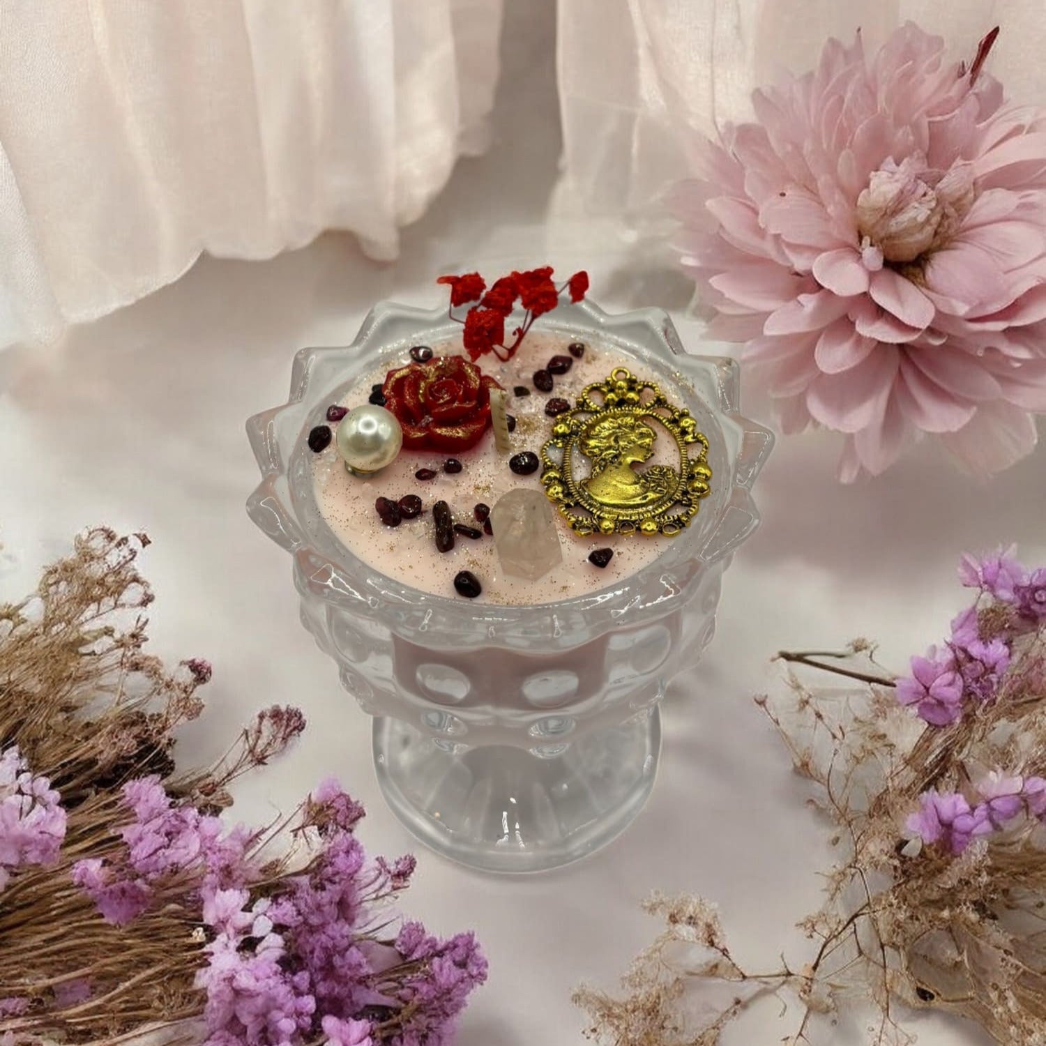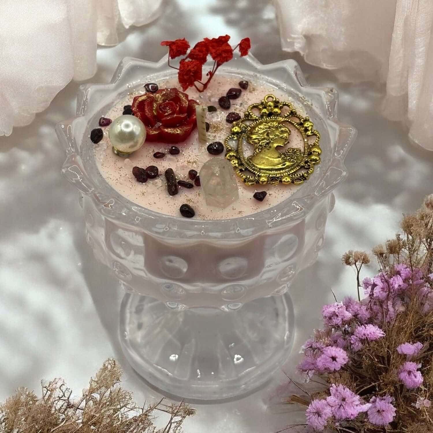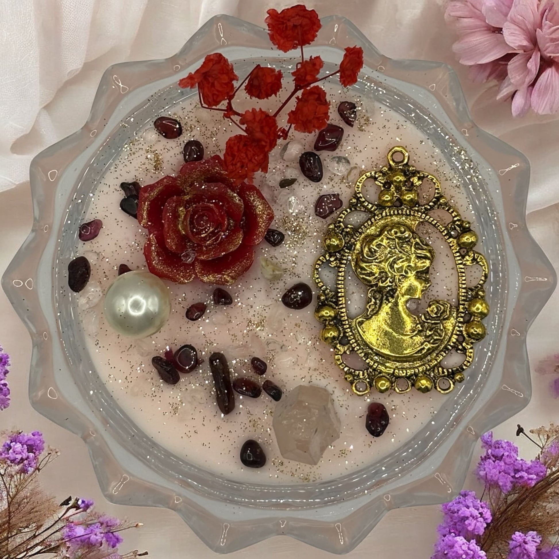 Sa cire végétale, naturelle et éthique, accueille un décor inspiré des cabinets secrets : une rose rouge sculptée, un camée doré, une perle nacrée, et quelques fragments de grenat et de cristal de roche — symboles d’amour, de clarté et de profondeur.