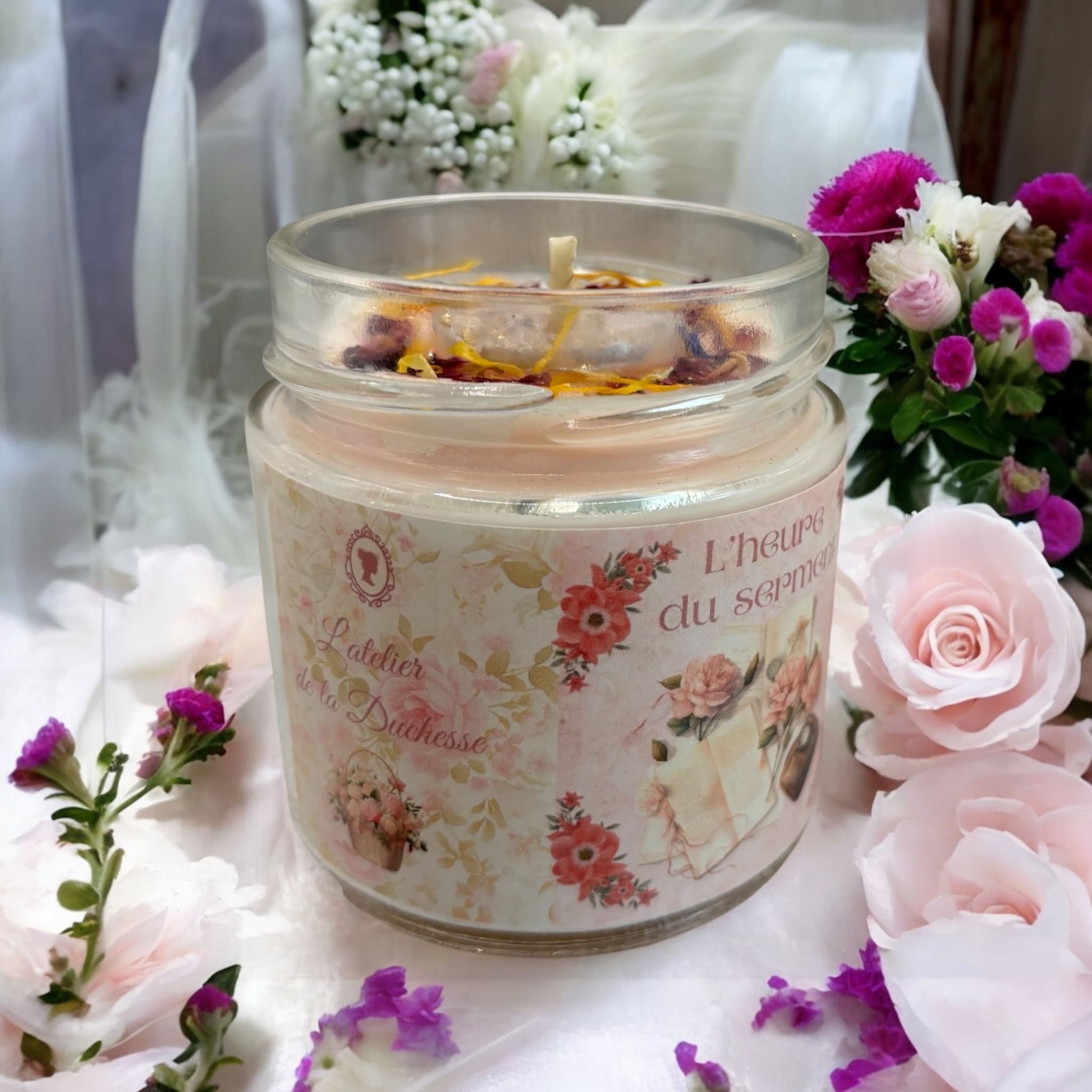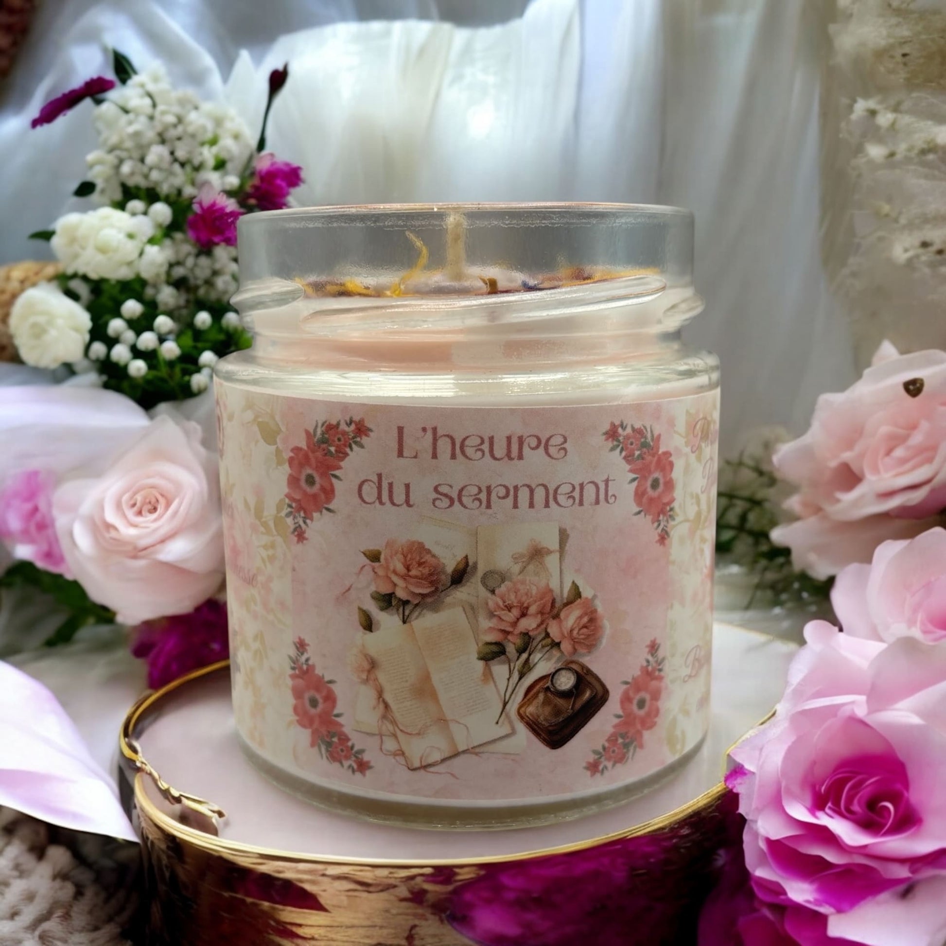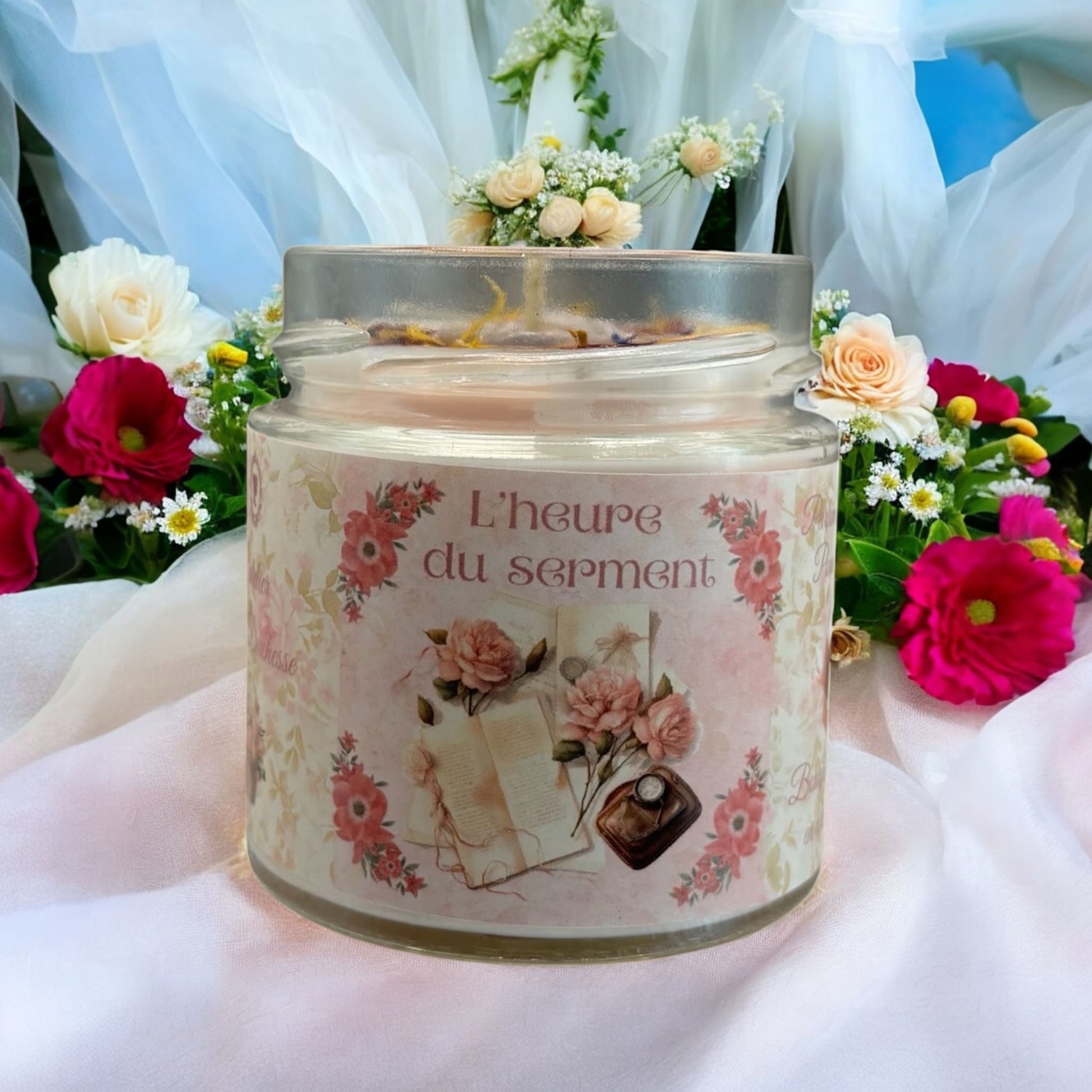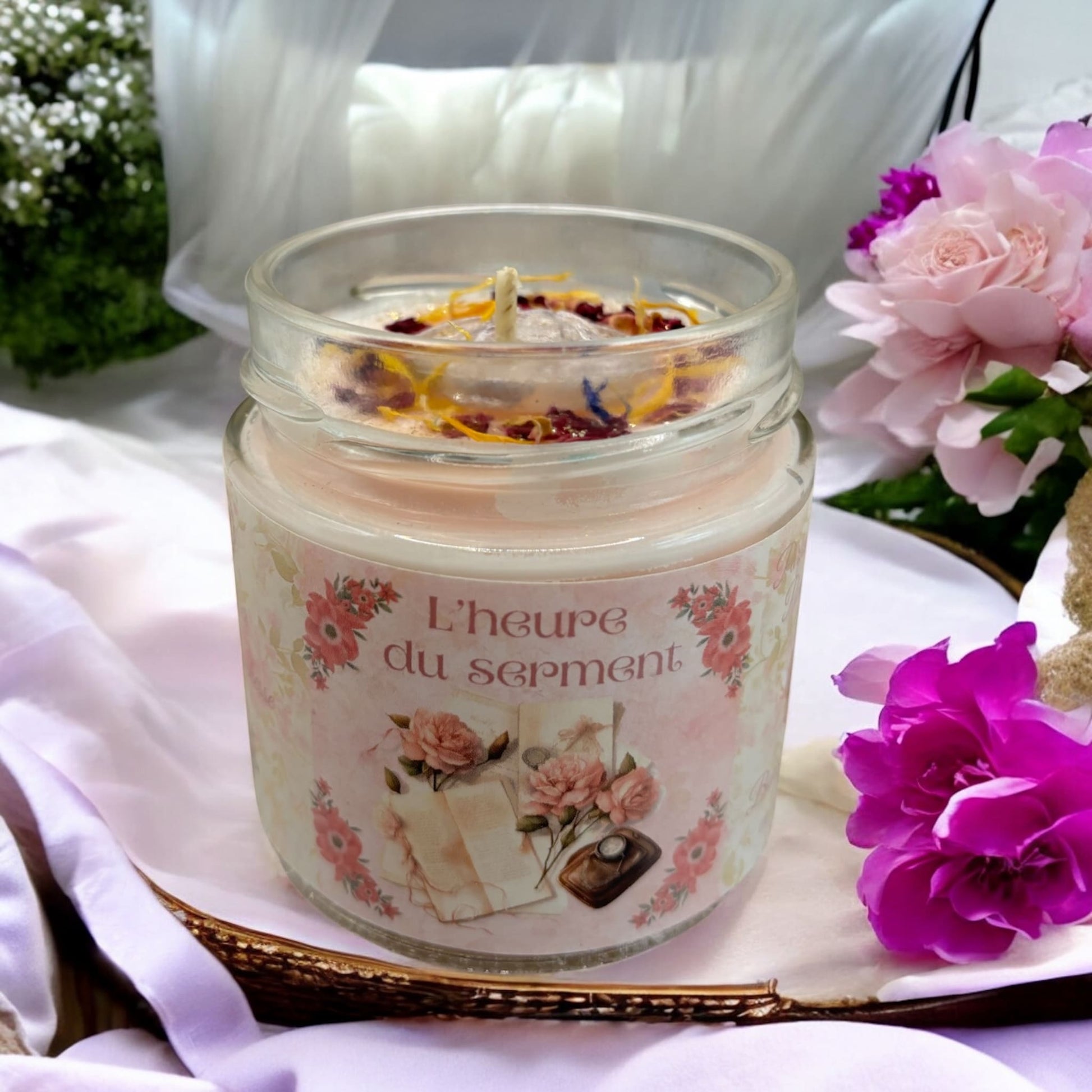 "L’heure du serment", c’est ce moment où tout ralentit. On retient son souffle, les regards se croisent, et plus rien n’existe autour. C’est le cœur qui bat un peu plus fort, juste avant de dire "oui". Une bougie qui capture cette émotion-là : douce, sincère, pleine de promesses.