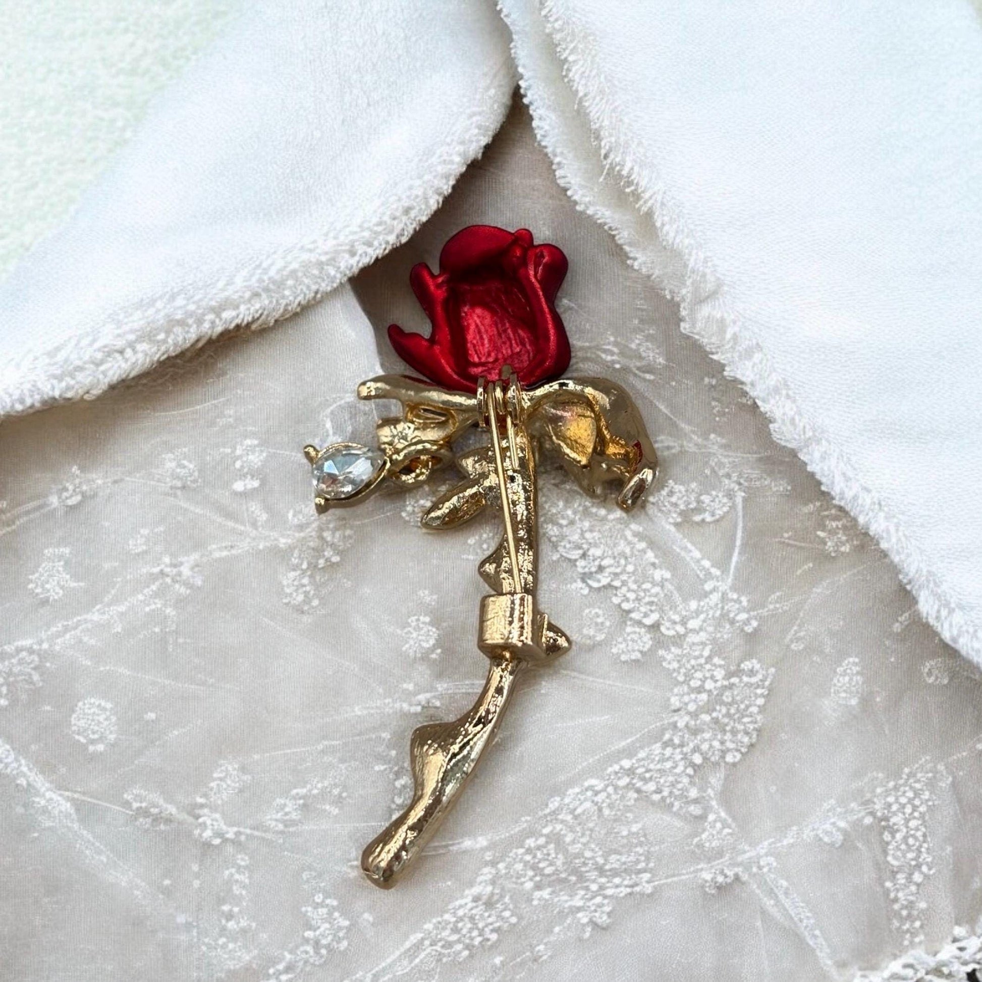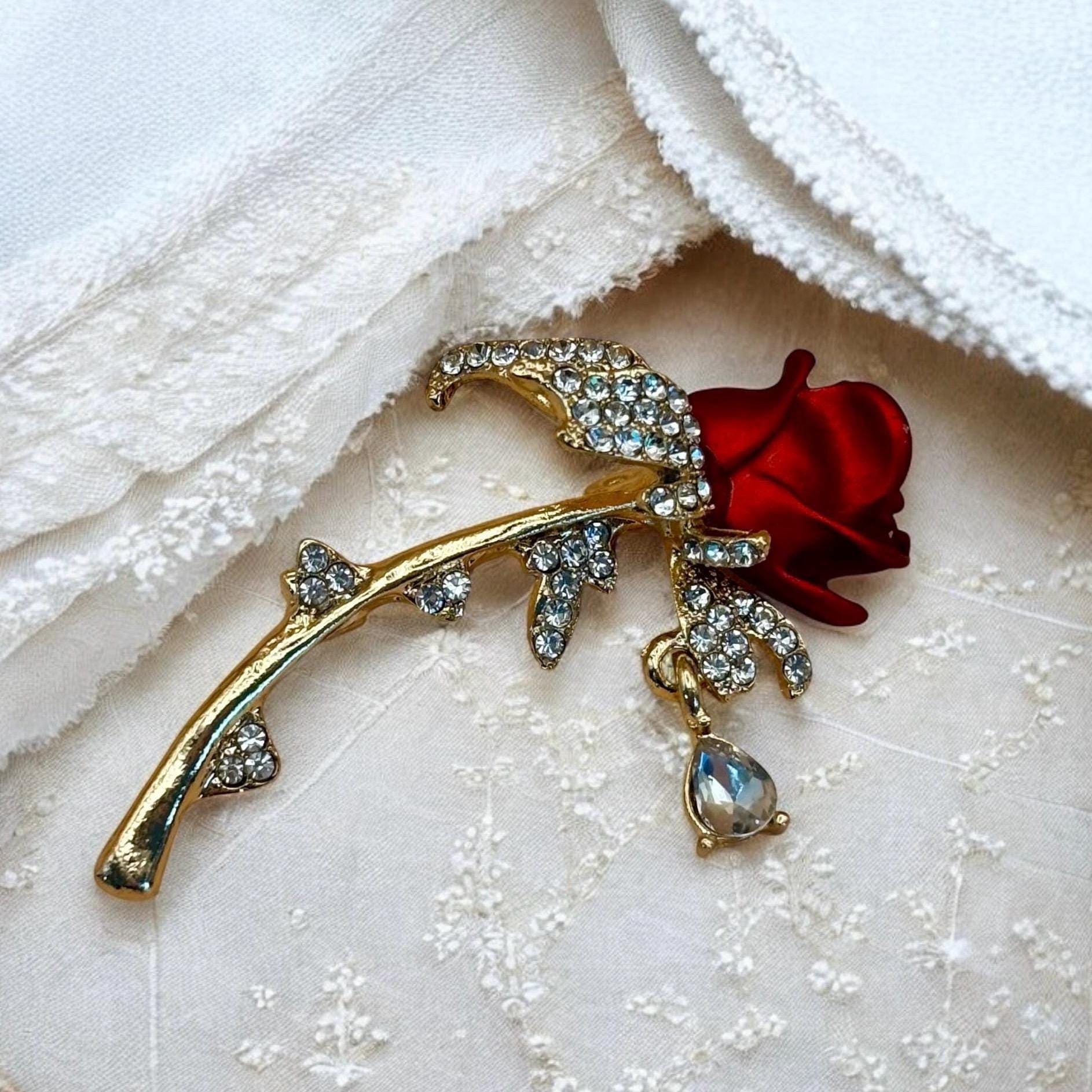 Une rose rouge flamboyante, posée délicatement sur une base dorée, sertie d’éclats argentés… Cette broche incarne la passion, le raffinement et l'élégance d’une époque révolue, chère à l’univers de Bridgerton.